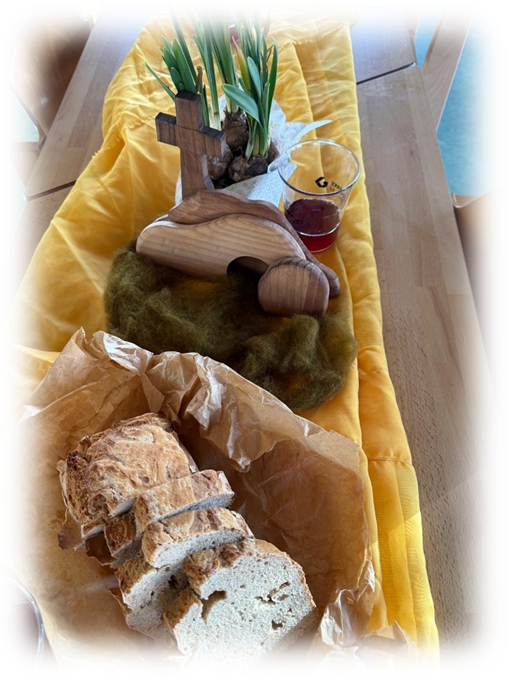 Heute haben wir uns dann, auf eine besondere Reise begeben: Gemeinsam haben wir uns mit der ganzen Ostergeschichte beschäftigt. Im Mittelpunkt stand Jesus Christus und die Frage, warum wir Ostern feiern. Dabei haben wir bewusst einen kindgerechten Zugang gewählt, bei dem die Kinder die Inhalte nicht nur hören, sondern aktiv erleben konnten. Zu Beginn haben wir darüber gesprochen, wie schön es ist, gemeinsam Zeit zu verbringen und miteinander zu essen. Anschließend haben wir die Geschichte erzählt: von Freundschaft, einem besonderen gemeinsamen Essen, einem traurigen Moment und schließlich von neuer Hoffnung. Ein besonderer Moment war unser gemeinsames „Tisch-Erlebnis“:Die Kinder saßen gemeinsam, teilten Brot und tranken Traubensaft. So konnten sie ganz praktisch erfahren, was Gemeinschaft bedeutet und wie verbindend gemeinsames Essen sein kann.
